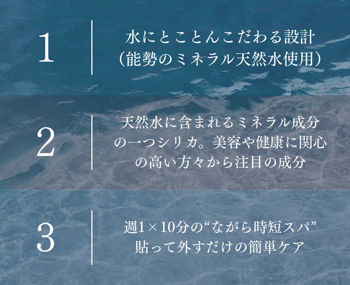 - 水の美容液と呼びたくなる、 シリカ豊富な能勢の天然水ベースの、潤す贅沢パック。