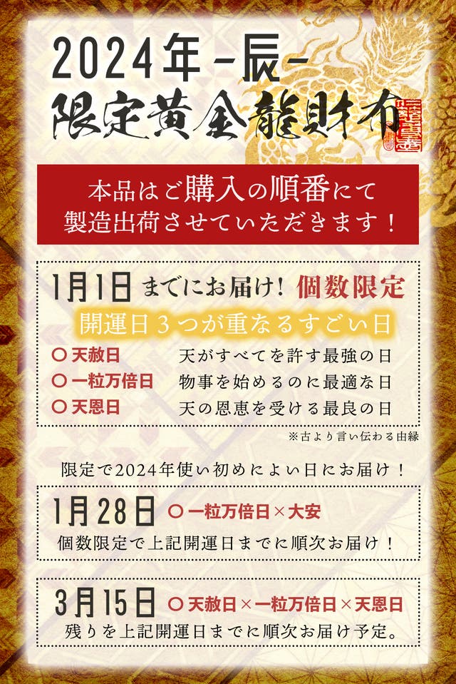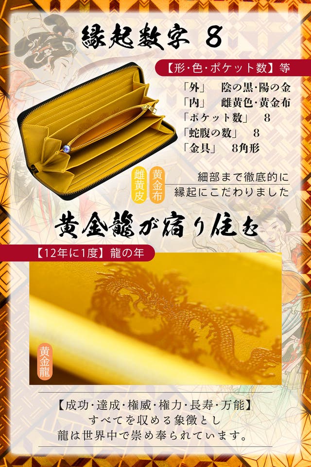 ご存じの通り古来より「龍」の開運力は1番とされ、また新年はお財布の購入に最適なタイミング!何かを始める・人生を変えるのにおすすめの年と伝えられています!