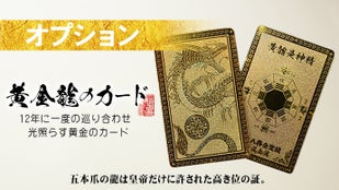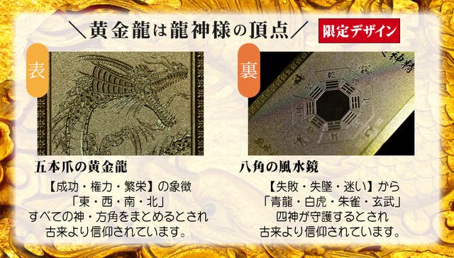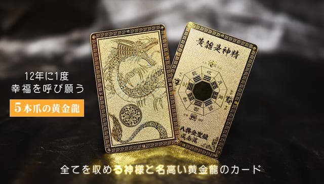 黄金に輝くカードの表には「東西南北」全方角の神様を従える最上位の龍である「5本爪めの黄龍」が描かれています。