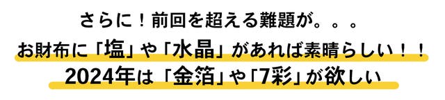 お財布の運気を整えて、運気を綺麗にする浄化の御塩(みしお)と本水晶紛(ほんすいしょうふん)さらに特別に2024年、金箔(きんぱく)と七彩(しちさい)で縁起を限界まで担ぐ。