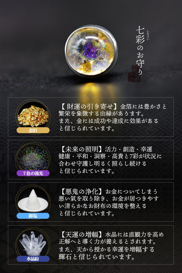 龍神と七彩・金は非常に相性がよいとされ、良い氣を高め呼び込むとされています。塩・水晶による「浄化や厄を跳ね除ける」効果に「達成や輝かしい未来」を願います。
