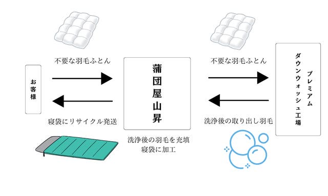「ふとん」から「ふとん」にリサイクルではなく、新たに「寝袋(シュラフ)」にリサイクルできる事を広く周知させる事で、リサイクルを促進していきたいと考えています。