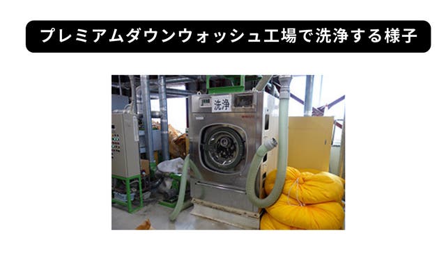まず、羽毛ふとんをお客様から当店に送っていただきます。中身を取り出して、プレミアムダウンウォッシュができる工場で洗浄を行います。洗浄すると羽毛が生き返り、ふわふわになります。