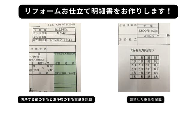 羽毛ふとんのリフォーム後、明細書をご用意しています。洗浄前の羽毛重量、洗浄後の羽毛重量、どのマスに何グラム充填したかを記載しています。
