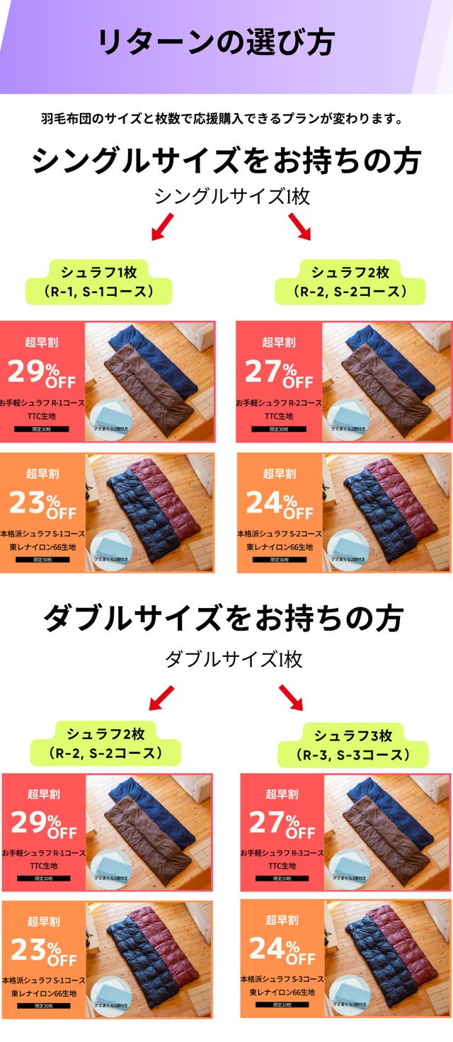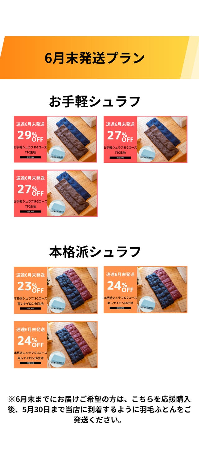 ※期日までに羽毛布団が届かない場合は記載の配送予定月までにリターンをお届けできない可能性がございます。万一羽毛布団の発送が遅れる場合は、Makuakeメッセージにてご連絡お願いいたします。別途配送日をご相談させていただきます