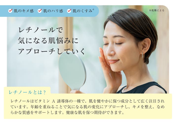 レチノールはビタミンA誘導体の一種で、肌を健やかに保つ成分として広く注目されています。年齢を重ねることで気になる肌の変化にアプローチし、キメを整え、なめらかな質感をサポートします。健康な肌を保つために、肌のうるおいやハリをサポートする成分が含まれています。