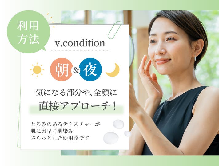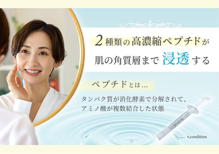 「v.condition」は、2種類の高濃縮ペプチドを使用し、肌に弾力とハリをもたらします。これらのペプチドが肌の角質層まで浸透し、内側からしっかりとサポートすることで、引き締まった印象を与えます。