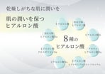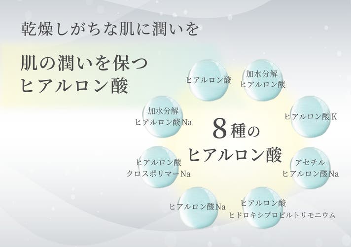 8種類のヒアルロン酸が配合されており、乾燥しがちな肌に潤いを与えます。保湿効果で、肌をしっとりと保ち、美しく健康的な肌を維持することが可能です。