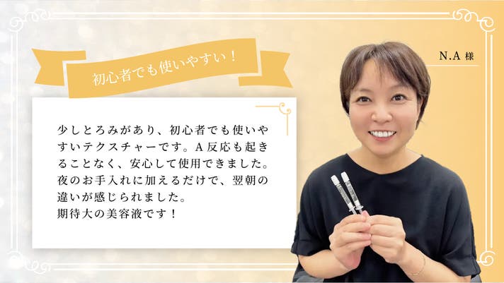 A: 初めてお使いの場合は、「レチノール反応(レチノイド反応・A反応)」が生じる場合があるので、2、3日に1回程度の使用からはじめ、2週間ほど使っても問題がなさそうであれば頻度を増やすなど、様子を見ながらの使用を推奨いたします。