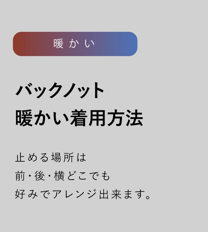 結び目がゴワつくバックノット。止めることで、すっきり。寒い時は高さを出せば、耳あて代わりに。