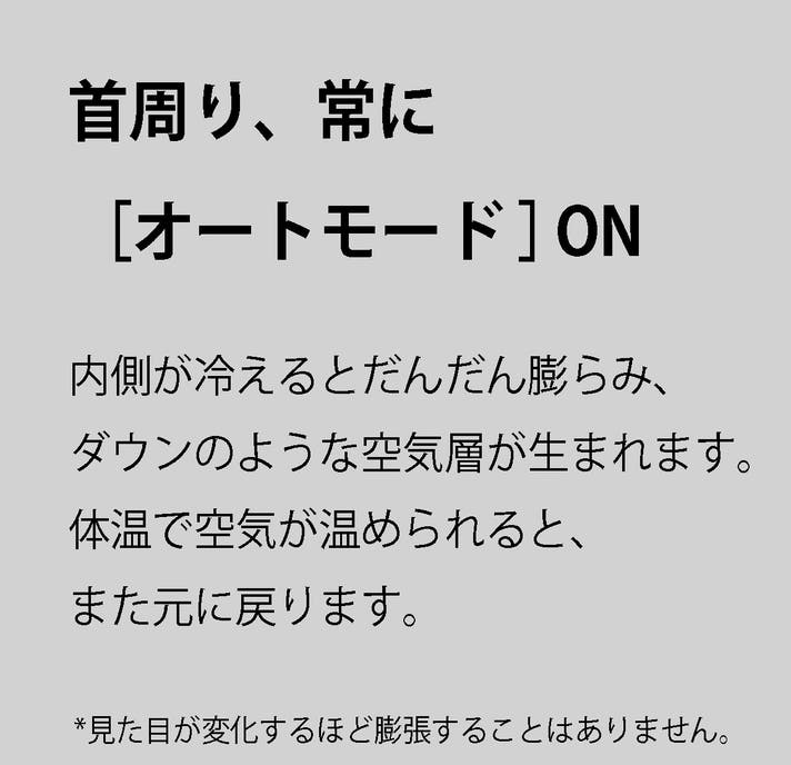 A:シートはおよそ10℃〜0℃前後の環境で徐々に膨らみます。マフラー内部の温度が下がるまでに時間を要します。また体温の影響を受けるため、膨らみは穏やかに調整され、自然なボリューム感を保ちます。冷えた環境に移動してすぐにモコモコになるものではありません。