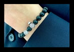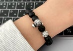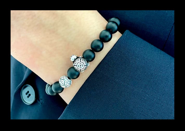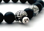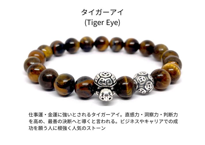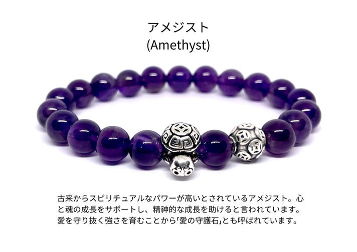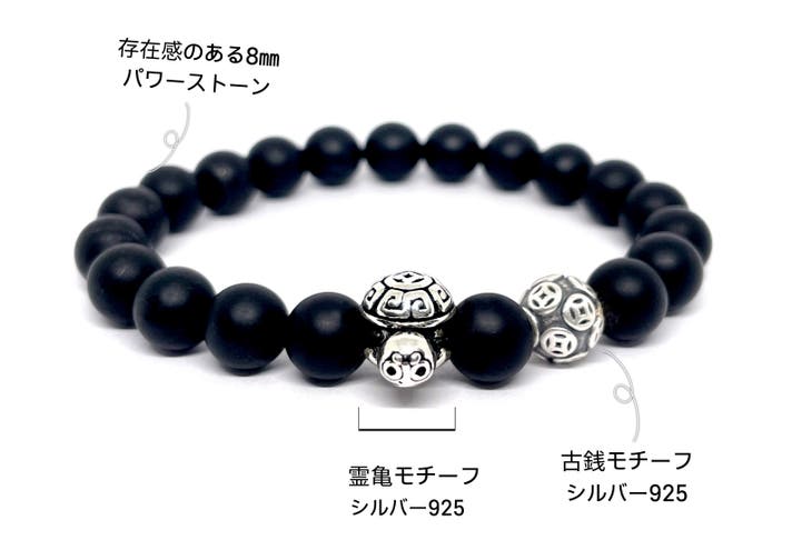 健康・長寿のシンボル「霊亀モチーフ」と財運を意味する「古銭モチーフ」はSILVER925。いぶし銀加工で深みのあるデザインとなっています。周りに人気のパワーストーンをあしらいました。ストーンは存在感のある8ミリを使用。男性のしっかりした手首にもよく似合い、女性の手首は華奢に見せてくれるサイズです。