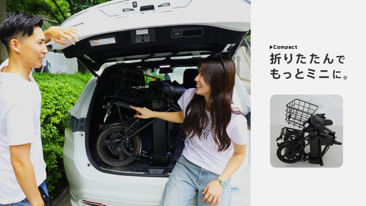 ミニに折りたためるので自動車に2台車載も可能。アップダウンが激しい山道でもパワフルモーターによるトルクで、大自然でのランデブードライブを満喫。アウトドアの頼れる相棒です!