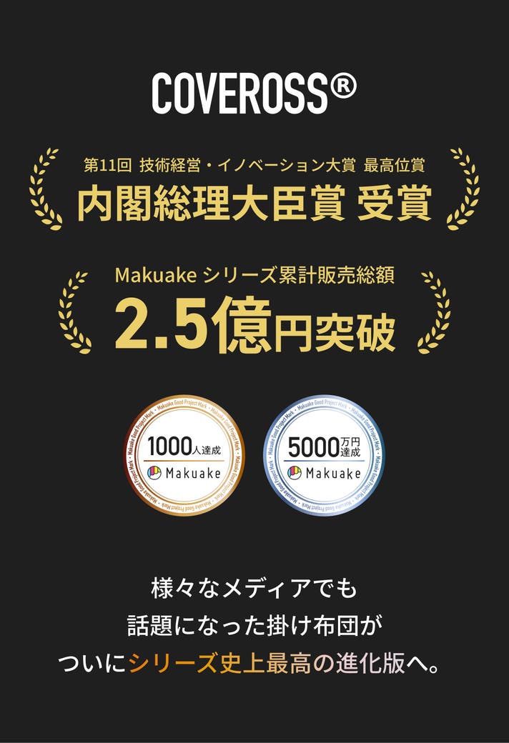 「Makuake(マクアケ)」は、実行者の想いを応援購入によって実現するアタラシイものやサービスのプラットフォームです。このページは、 プロダクトカテゴリの 「365日1枚で完結、快適な温かさの未来の掛け布団 | 内閣総理大臣賞受賞カバロス」プロジェクト詳細ページです。
