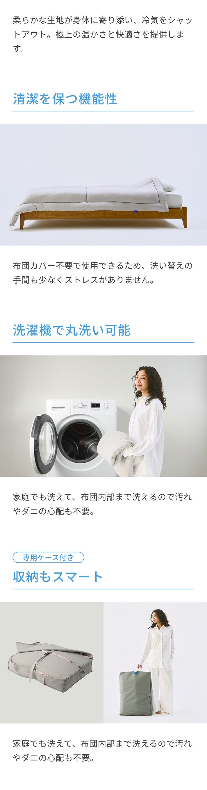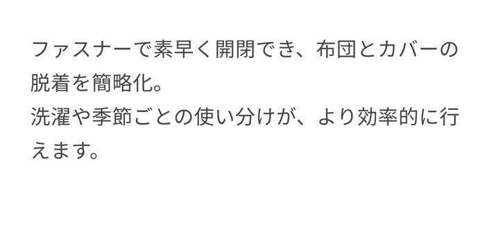 - 二重構造で冬はあたたかく、通気性で夏は涼しい。オールシーズン一枚で完結する布団。
