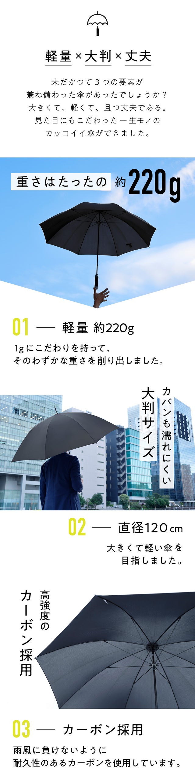 本製品は傘の持ち手から先端にかけて伸びる「中棒」までカーボンを使用しているため、強風が吹いても高い耐久性を兼ね備えています。