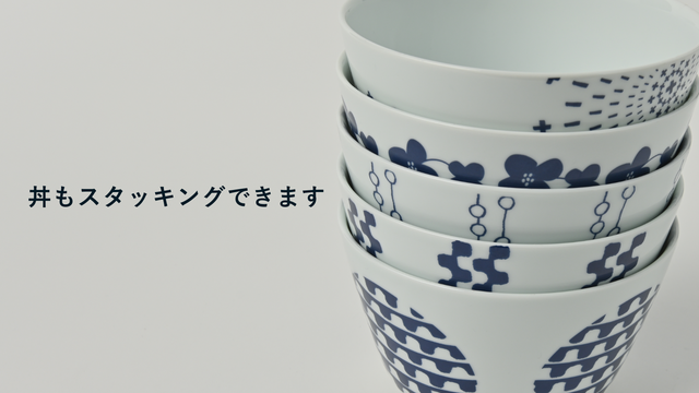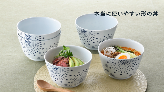 美しい白磁にどれも落ち着いた紺色のデザインですが、華のあるちょうどよい丼ぶりに仕上がりました。