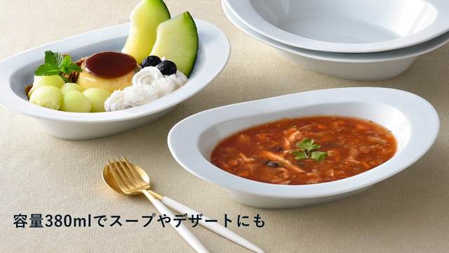 満水時で約380ml、深さも4.5cmほどありますので、カレーやシチューはもちろん、パスタなどのメインディッシュに最適。