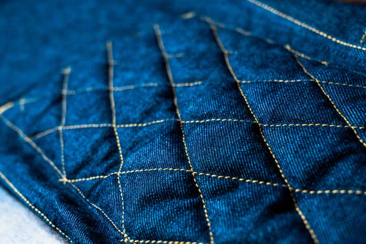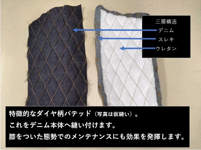 美しいキルティングに柔軟かつ保護性も盛り込みました。上から被せるデニム生地と中のウレタンフォームをダイヤ柄に縫い込んでいるので使い込んでもウレタンが片寄りすることがありません。立ち膝でのメンテナンスにも効果を発揮します。