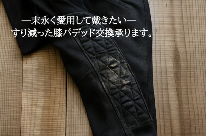 穿くにつれてゆっくりと現れるエイジング感はデニムパンツの醍醐味です。でも膝パデッドが裂けたりすると内部素材がはみ出すこともあります。それはそれでヴィンテージ感があって良い場合もありますが、元の状態にしたいという方は、ご連絡いただれば交換承ります(有料)。いつまでも長くご愛用下さい。