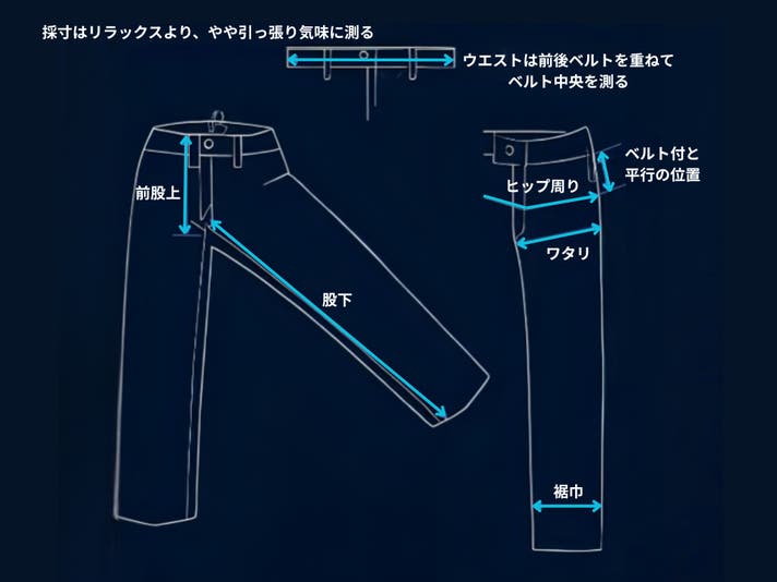 ウエストは、緩めではなく軽くテンションをかけた状態で測るのが目安ですが