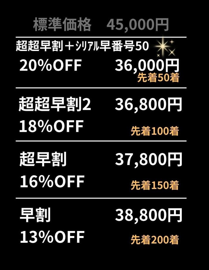 【超超早割+シリアル早番号50】36,000円(20%OFF)数量・シリアル1~50番確約、さらに購入順番の番号で刻印します。期間限定の最得リターン!