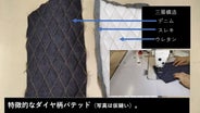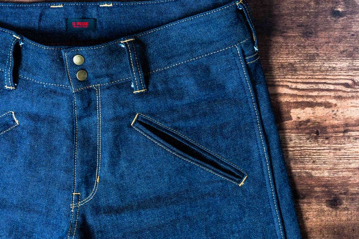三層構造(デニム+スレキ+10ミリ厚ウレタン)としライディングの安定感を提供。