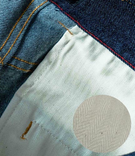 ポケットは深く(フロント約21.5cm、バック約21cm)し、美しい杉綾(ヘリンボーン)を採用。しなやかで強靭な生地に美しさも備えています。
