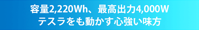 - 大容量2,220Wh、最高出力4,000W出力! テスラも動かせる圧倒的ハイパワー