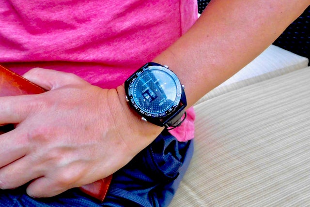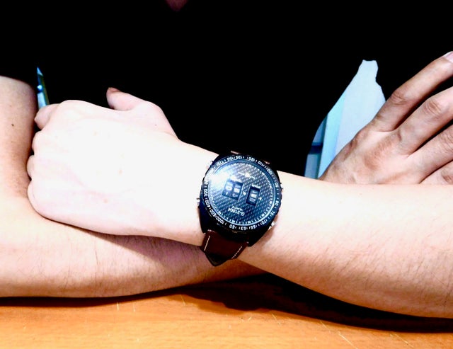 カーブのついたグラス風防の中には、カーボンファイバー調の柄文字盤。シルバー色のデジタルなフォントが時間表示を明確に。