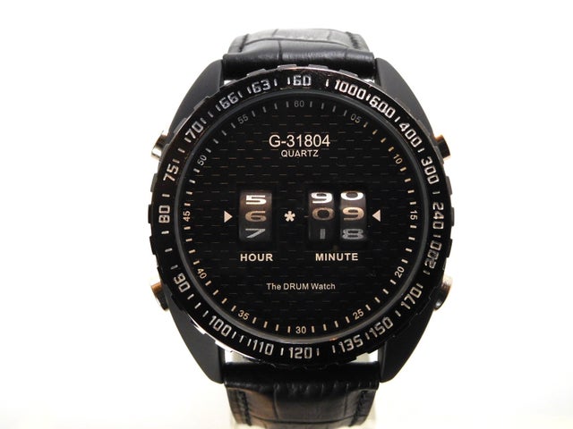 ドラム式腕時計黒ストラップ5%OFF+牛革型押しストラップ
