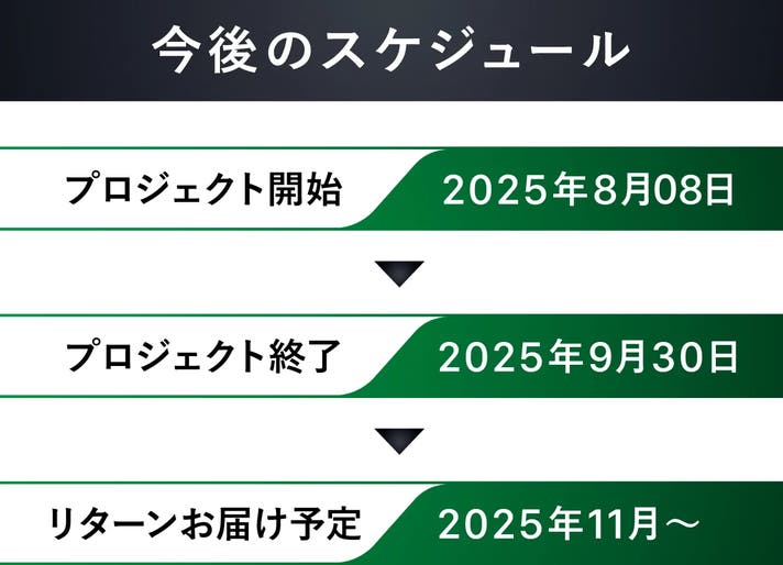 このプロジェクトはAll in型です。目標金額の達成に関わらず、プロジェクト終了日の2025年09月29日までに支払いを完了した時点で購入が成立します。