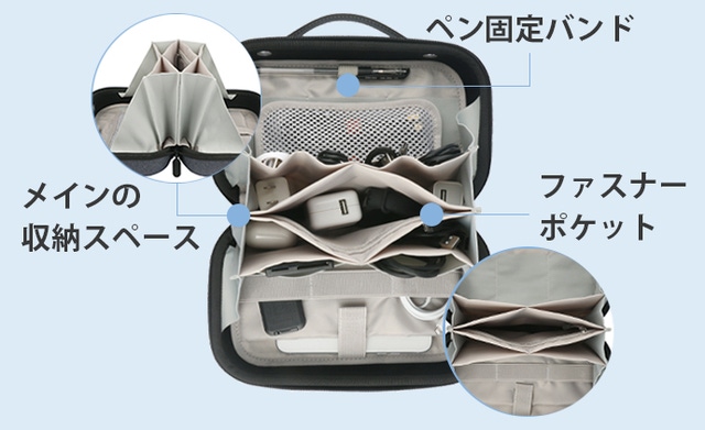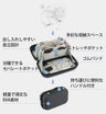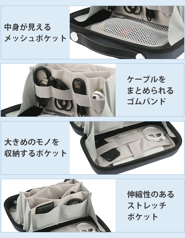 中身が見えるメッシュポケットや絡まりがちなケーブルをまとめられるゴムバンド、大きめのアイテムを収納しやすいフラットポケット、伸縮性のあるストレッチポケットなど、多彩な収納スペースを備えています。