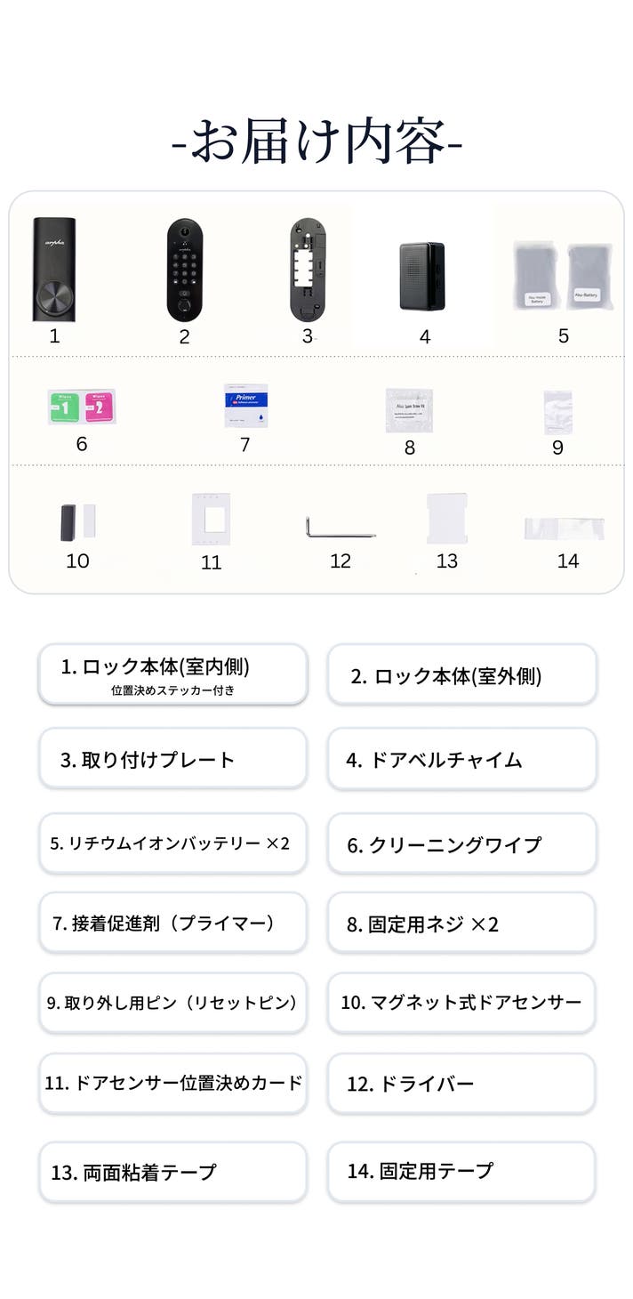 【配送遅延とキャンセルについて】 本文中に記載させていただいたスケジュールは、あくまでプロジェクト公開時点の予定です。応援購入の性質上、配送遅延のおそれがございます。原則として、配送遅延に伴う応援購入のキャンセルはできませんが、リターン配送予定月から 1ヶ月 を超えた場合には、希望者に限りキャンセルにて対応させていただきます。 並行輸入品が発生する可能性があります。正規以外での個人輸入等は、完全に防ぐことができない場合がございます旨、予めご了承のほどお願いいたします。 並行輸入品は正規代理店による製品保証を受けることができません。 【商品等の不具合による返品・交換】 ※「返品交換に関する留意点」を必ずご確認いただき、記入例を参考に記載してください。 ◾️対応条件:商品初期不良/配送中の破損/内容物不足/ご注文内容と異なる商品が届いた場合 ※商品到着後14日以内に、プロジェクトページの「実行者にメッセージ」よりご連絡ください。 ◾️返金額:原則として リターン代金(税込)の全額 (※交換品の手配が可能な場合は、交換対応を優先する場合があります) ◾️返品送料/再送料:実行者負担 【返品・交換をお受けできない商品】 • サポーター様のご都合による返品・交換 (例:イメージ違い/取り付けができなかった等の事前確認不足/誤注文) • 事前連絡なく返送された商品 • 商品到着後、15日以上経過した商品 • サポーター様の責任により破損・汚損が生じた商品 • 付属品・パッケージ等の欠品がある商品 【取り付けに関する注意】 • 取り付けは基本ドリル不要(強力粘着テープで固定)です。 • 取り外し時は、粘着部分を温める(例:ドライヤー)ことで剥がしやすくなります。 • 古い木製ドア等で粘着が不安な場合、任意でネジ固定できる穴があります(ネジ固定は自己判断)。 • 上下2つ鍵(ダブルロック)のドアは、基本的に鍵1つにつき1台必要です。