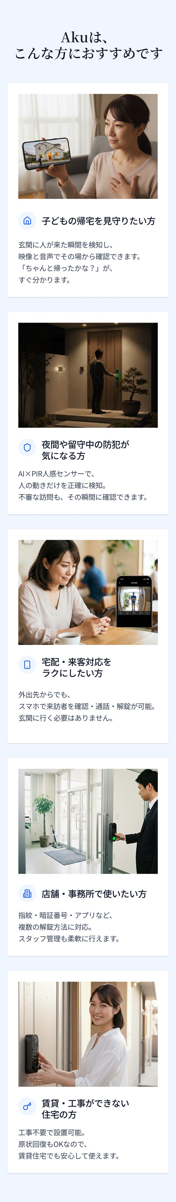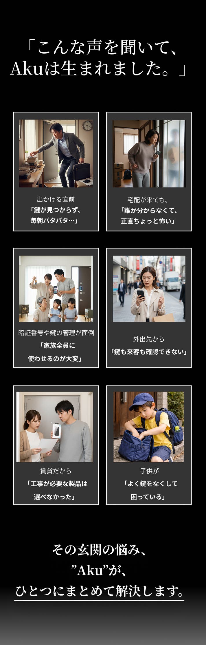 今回ご紹介する「Aku」は、子育て家庭や共働き家庭の“玄関の不安”を減らしたいという想いから取り扱いを決めました。