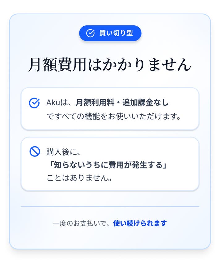 Akuは月額費用・サブスクリプション料金不要で、購入後は追加費用なしですべての基本機能をご利用いただけます。