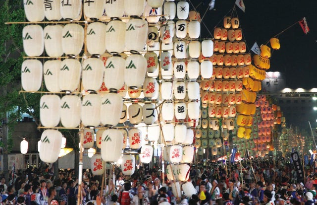竹竿に垂直に横竹を繋ぎ、提灯をつるし、バランスを取りながら持ち上げて技を競う豪快な芸能。