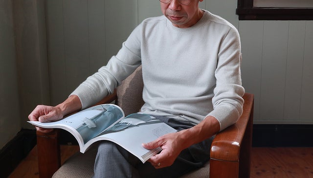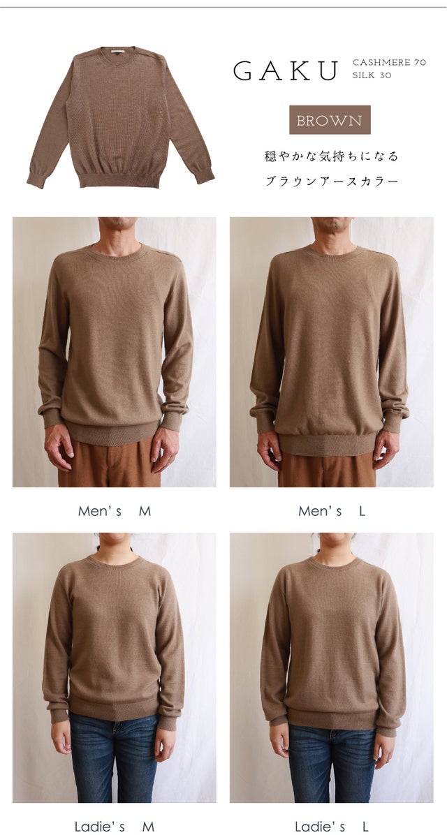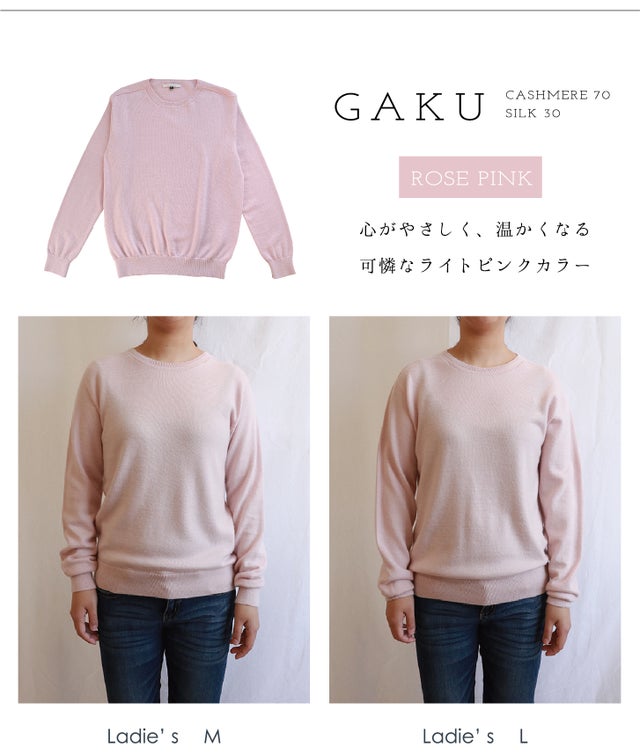 カシミヤ70%シルク30%の混紡糸「GAKU」で編み上げるセーターの表面はカシミヤの柔らかい繊維がふんわりと立ち上がり、細かい編目にシルクの艶が輝きます。