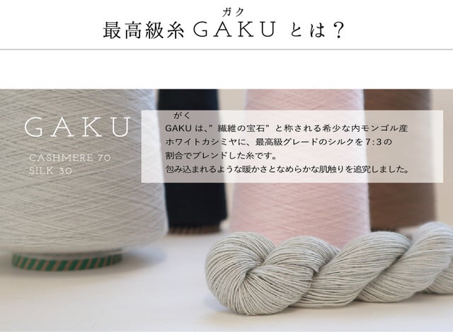 この製品に使ったHASEGAWAのオリジナル糸GAKU(ガク)は、カシミヤとシルクの混紡糸で、天然素材の原料からこだわった最高級糸です。包み込まれるような温かさと滑らかな肌触りを追求しました。