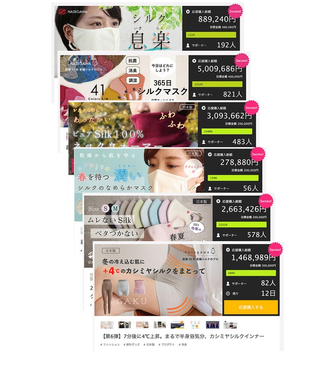 私たちは当社シルク製品の良さを、より多くのお客様にお伝えできたらと昨年から積極的にクラウドファンディングプロジェクトに取り組み、皆様のご支援によって第1弾〜第7弾まで成功をおさめることができております!