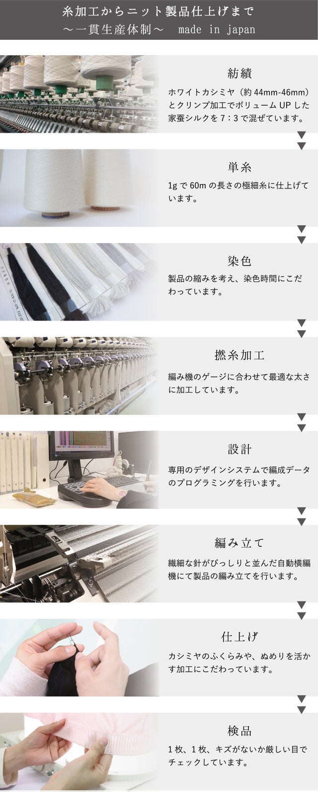 カシミヤの繊維が沢山の空気を抱き込むことで保温・保湿性に富み、柔らかくとてもしなやかです。シルクは光沢と強度があり吸湿性・消臭性に優れています。どちらも極細の原料を厳選している為、皮膚に刺激を与えにくい優しい素材です。
