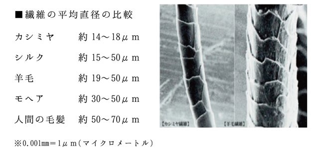 カシミヤヤギの生息地は、年間寒暖差60℃という厳しい気象条件で、その環境が保温性に優れた柔毛を生み出します。当社が扱うホワイトカシミヤの繊度(繊維の太さ)は15.5〜15.7μm(毛髪の5分の1)でとても細いです。カシミヤの繊維はスケール(キューティクル)に覆われていますが、ウール(羊毛)に比べて滑らかなため、皮膚に刺激を与えにくい素材です。
