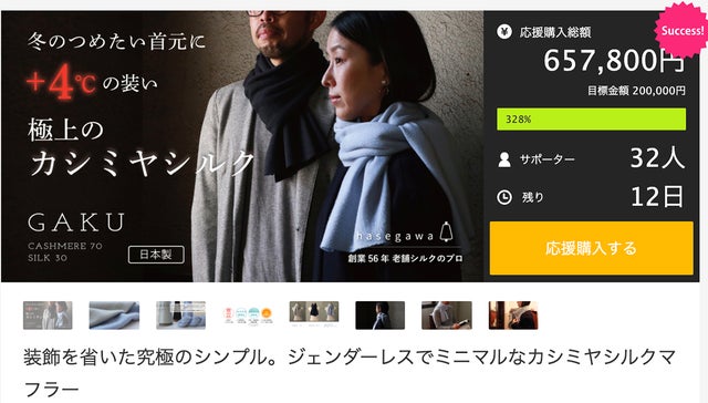 現在、第7弾の同GAKUシリーズ「GAKUカシミヤシルクマフラー」のプロジェクトが応援購入を随時承っております。ぜひご覧いただき、こちらの商品と合わせてカシミヤシルクで厳しい冬を乗り越えませんか。こちらプロジェクトの募集期間は12/13(月)18:00までです。(↓写真11/17時点)