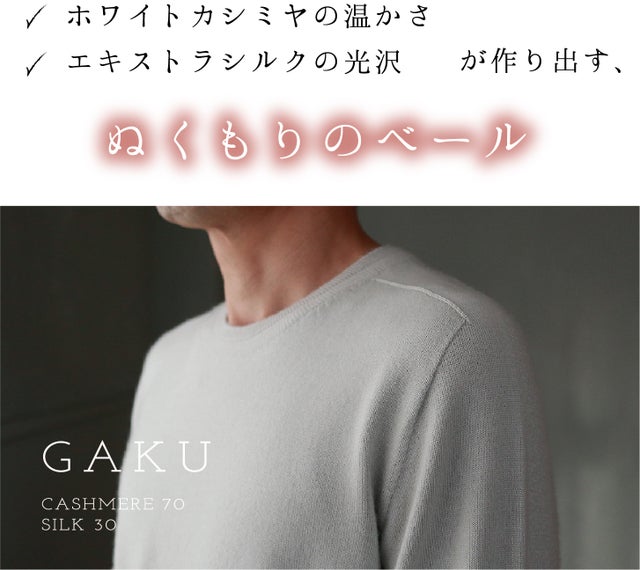 セーターに使用している糸は、カシミヤとシルクをミックスした天然ハイブリット糸(混紡糸) その名も「GAKU ガク」といいます。GAKUの機能性について紹介します。