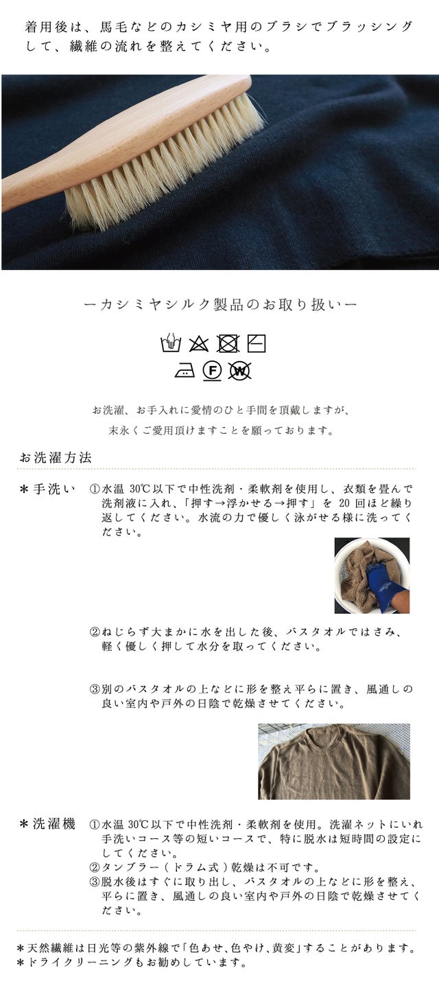 製品試験の結果で手洗い、タンブラー禁止、平干しとしなければ品質の保証はできないとしているため上記の洗濯絵表示を記載しています。しかし私は糸の構成と製品デザインをし、編立を行い、風合い出し加工(洗いと乾燥)から 仕上げまで自分で行っているため洗ったらどうなるか体験しています。