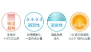 また、シルクはヒトの肌に最も近い組織でできた肌に優しい繊維で、調湿性や消臭性に優れています。※ 体臭ではなく、服にしみついた臭いに対する効果となります。
