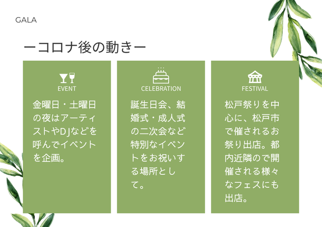 現在GALAは、オープン準備や資金調達をしながら、 皆様に楽しんでいただけるよう、日々励んでおります。 店舗内装デザインやメニューに関しましては、一部変更になる可能性もあります。 ご了承ください。 ※何か変更があった場合には活動レポートなどで共有を行なっていきます。 GALAで皆さまにお会いできるのを楽しみにしております。 スタッフ一同頑張っていきますので、応援のほどよろしくお願い致します。 本文中に記載させていただいたスケジュールは、あくまでプロジェクト公開時点の予定です。応援購入の性質上、配送遅延のおそれがございます。 原則として、遅延に伴う応援購入のキャンセルはできませんが、リターン配布予定月から6ヶ月を超えた場合には、希望者に限りキャンセルにて対応させていただきます。 当店が閉店、または営業ができなくなった場合は、本リターン使用権は無効となります。 緊急事態宣言、蔓延防止等重点措置に伴い、営業時間を変更している場合がございます。ご来店の際には店舗に直接ご確認ください。