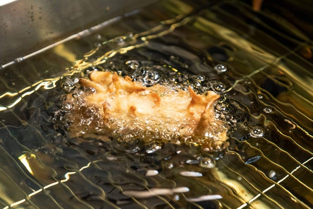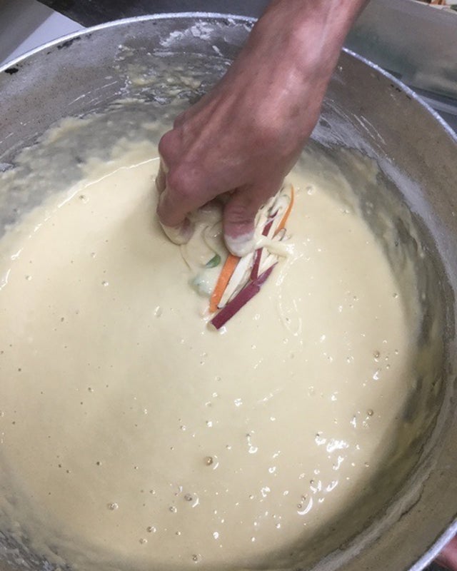 「至福のがね」は、当店「ろばた焼き明石」の店内メニューから生まれたものです。がねはもともと家庭料理なので、決まったレシピはなく、材料の組み合わせや切り方、粉の配合など、自店で100回以上の試作を重ね、現在の形が完成しました。