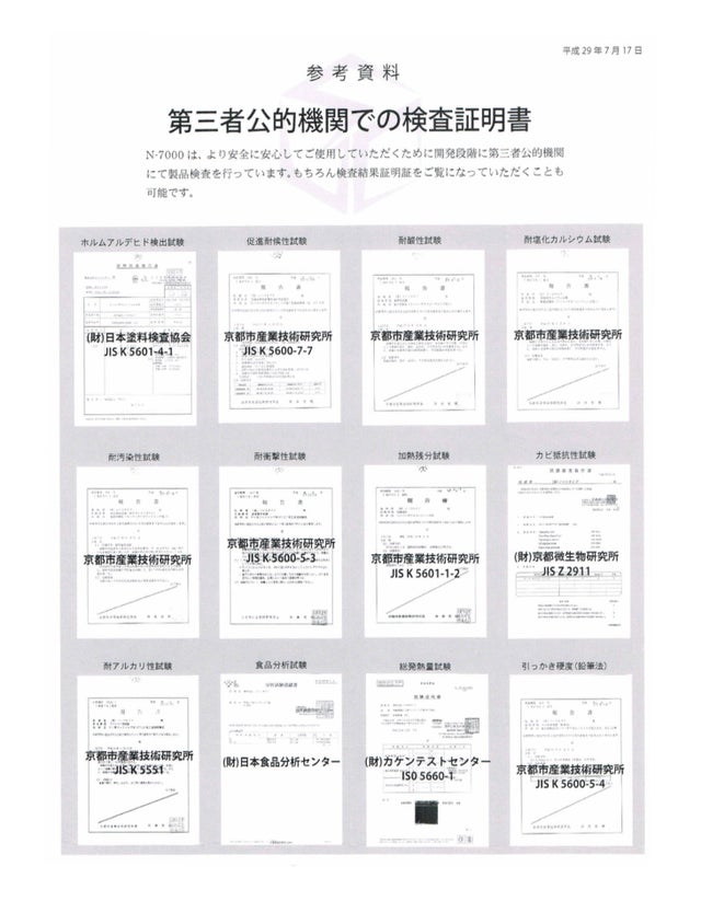ホルムアルデヒド検出試験/促進耐候性試験/耐酸性試験/耐塩化カルシウム試験/耐汚染性試験/耐衝撃性試験/加熱残分試験/カビ対抗性試験/耐アルカリ性試験/食品分析試験/総発熱量試験/引っかき硬度(鉛筆法)試験