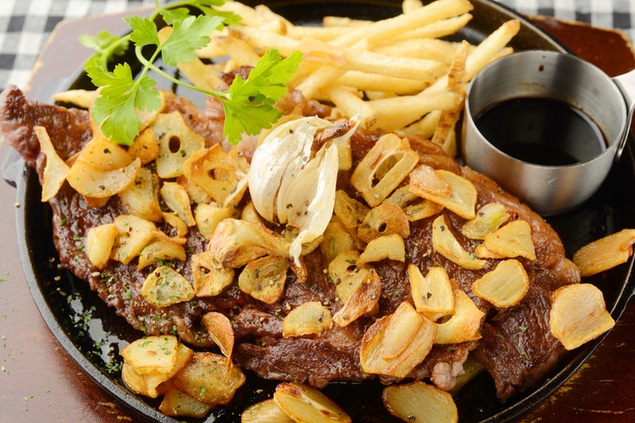 香ばしいガーリックをたっぷり乗せたオリジナルガーリックソース。当店の名物ステーキを是非!